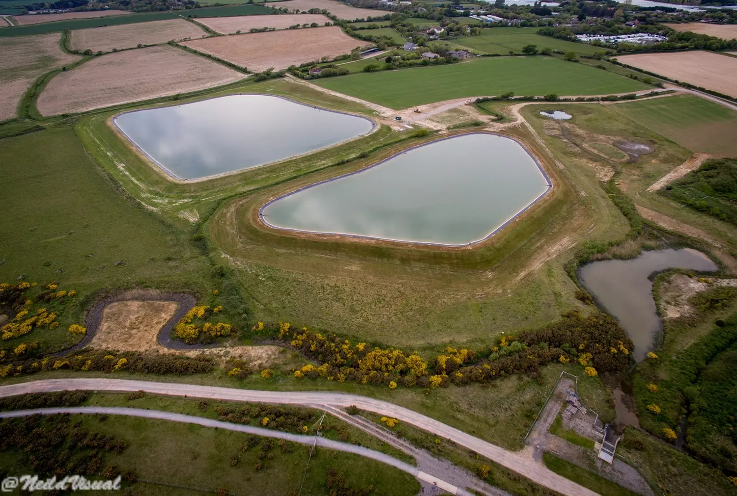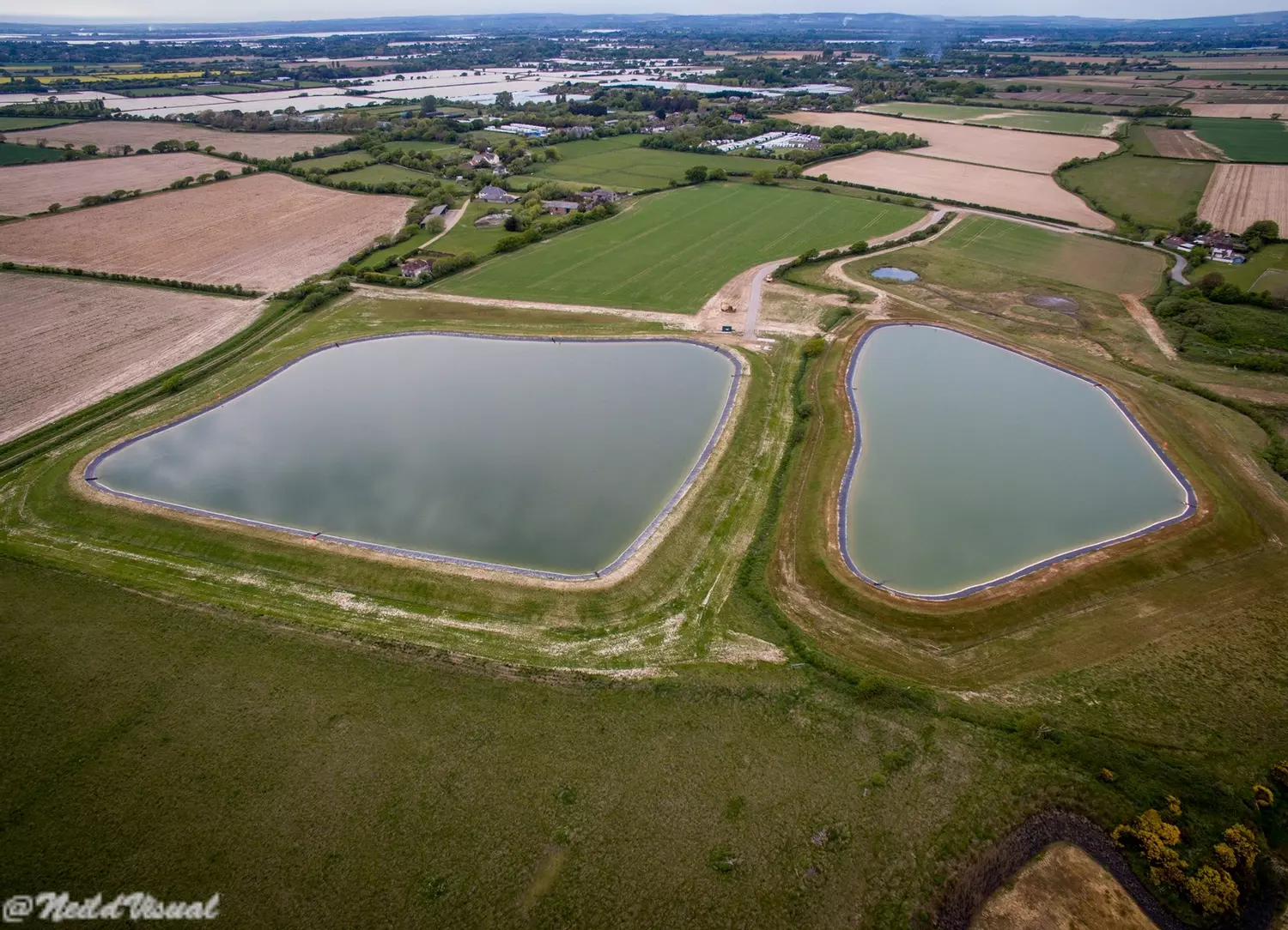 Two reservoirs recently constructed at Easton Farm April 2020, near Chichester, West Sussex.