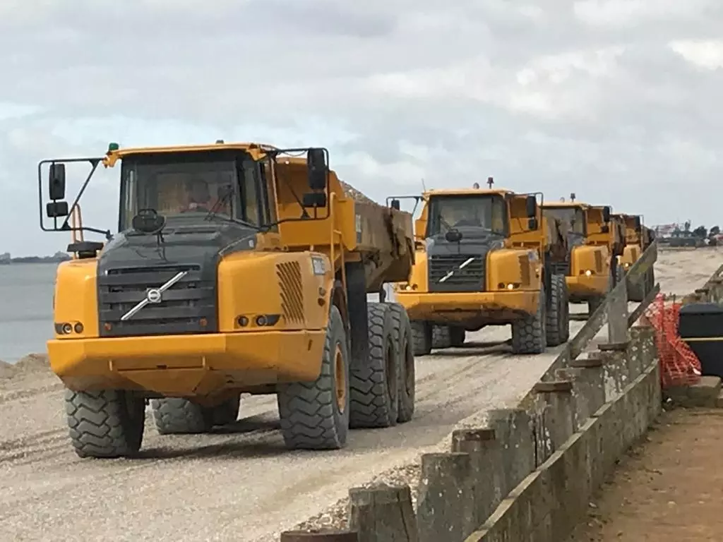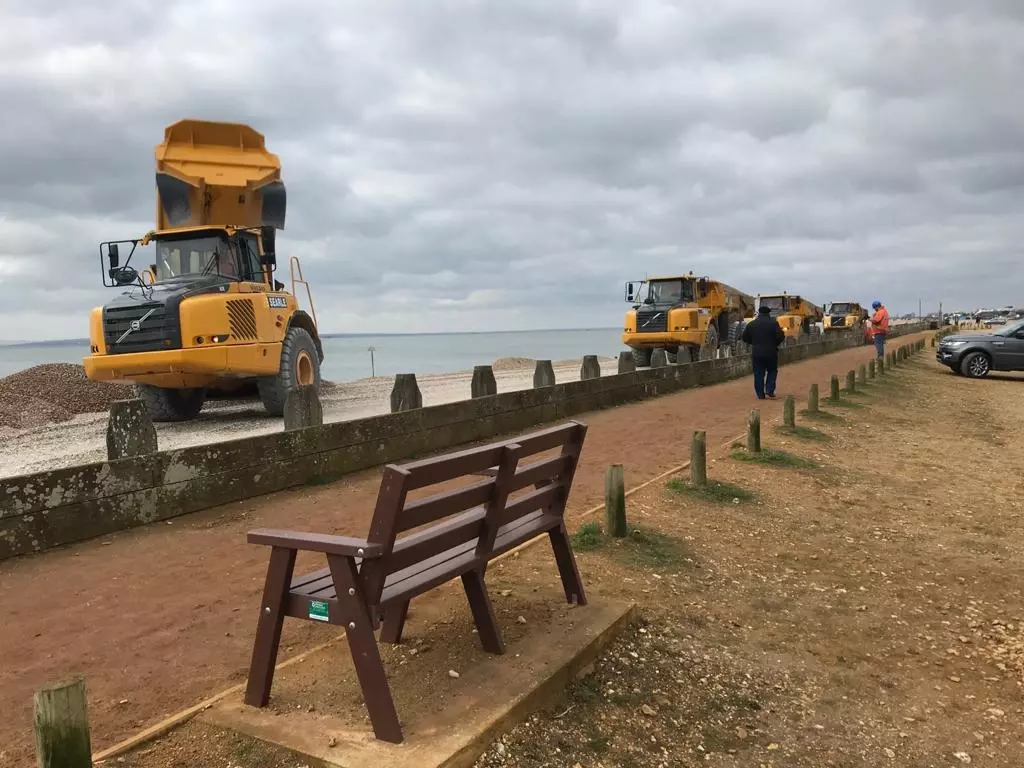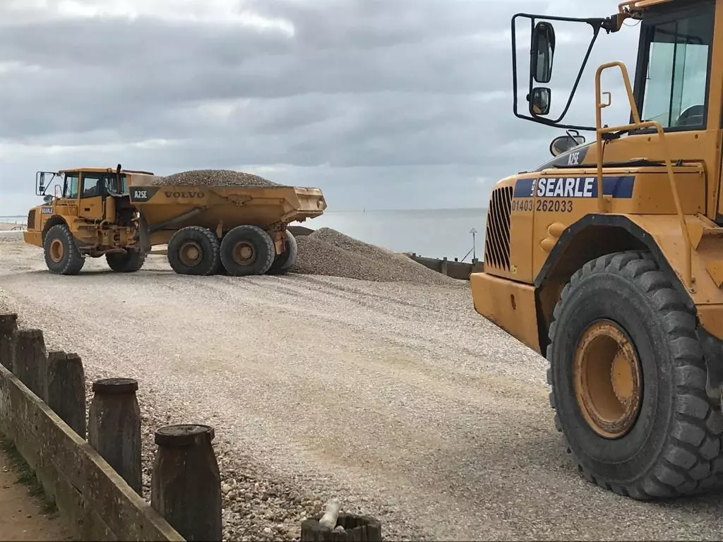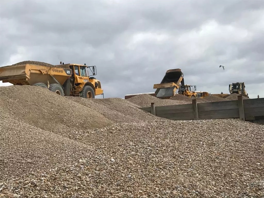 Shingle is excavated using 52t excavator and transported along to the groynes in 40ton dumptrucks, then the dozer levels the shingle in the groynes.